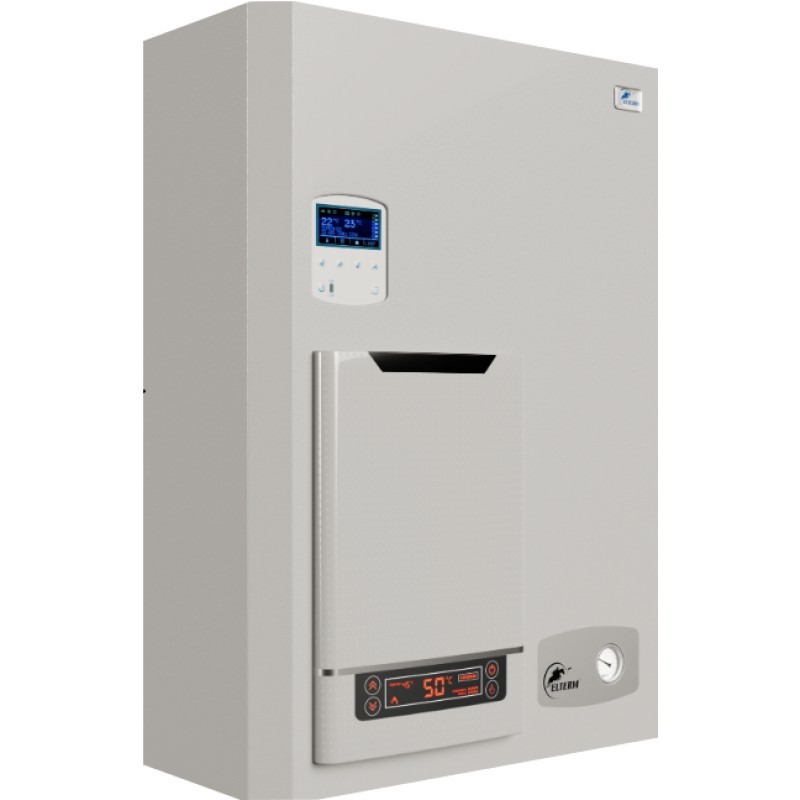 ELTERM Porucznik seri AsC-W 400V Elektryczny kocioł wodny o mocy 12 kW z przepływowym podgrzewaczem wody o mocy 12 kW z serią zaawansowaną LCD. Idealny jako główne lub alternatywne źródło ciepła w układach z PV. Wyposażony w sterowanie pogodowe i programator tygodniowy c.o. Kocioł może pracować w układzie otwartym i zamkniętym.