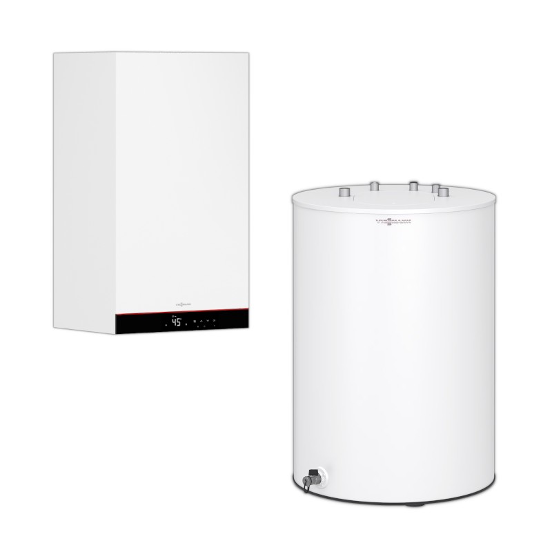 Pakiet Viessmann kocioł Vitodens 050-W B0HA kondensacyjny jednofunkcyjny w zakresie mocy 3,2-25 kW, wbudowany regulator E3, asystent pierwszego uruchomienia oraz zintegrowany moduł WIFI, palnik Matrix z systemem Lambda Pro. W zestawie z zasobnikiem Vitocell 100-W o pojemności 150l.