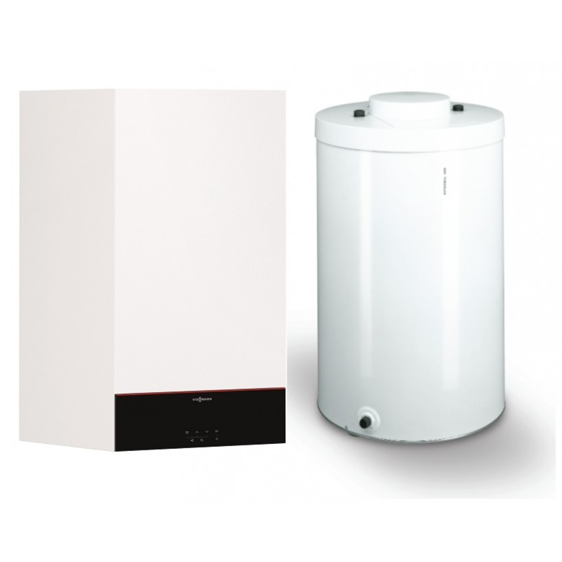 Pakiet Viessmann kocioł Vitodens 100-W typ B1HG kondensacyjny jednofunkcyjny w zakresie mocy 3,2-19 kW, wbudowany regulator E3 do, asystent pierwszego uruchomienia oraz zintegrowany moduł WIFI, Palnik Matrix z systemem Lambda Pro z zasobnikiem Vitocell 100-W o pojemności 120l wraz z zestawem przyłączeniowym i czujnikiem C.W.U.