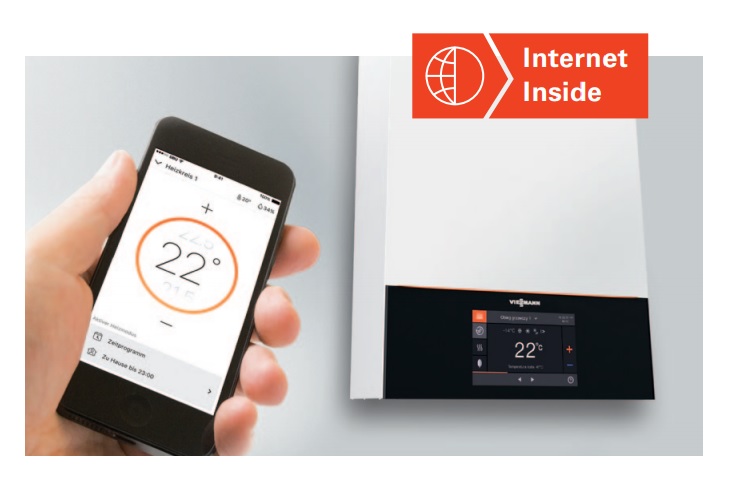 Poprzez zintegrowany interfejs WLAN kocioł kondensacyjny Vitodens 200-W komunikuje się bezpośrednio z Internetem, a tym samym może pracować w sieci i korzystać z serwisów cyfrowych. Aplikacja mobilna ViCare dodatkowo podwyższa komfort obsługi kotła. Dzięki niej mamy pod kontrolą wszystkie funkcje ogrzewania, niezależnie od czasu i miejsca. Aplikacja serwisowa może też w razie potrzeby bezpośrednio powiadomić fachowca i wezwać pomoc.